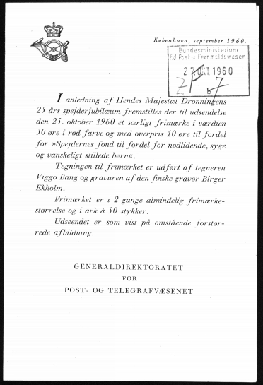 Purchased on Ebay in 2002, this Girl Guide item was hitherto unknown to me. It is a presentation folder for the Denmark Girl Guide stamp, issued October 25, 1960. The presentation folder was mailed from the Danish postal authorities to their colleagues in West Germany on the First day of Issue, informing about the new stamp. The presentation folder has on front a printed text in Danish, which gives information about the new stamp. Inside (page 2) of the folder is blank. Inside (page 3) contains a black print of the stamp in enlarged format, affixed to the folder. The reverse (page 4) is the address side with stamp and first day cancel. Please inform the author should you have further information on this presentation folder. |