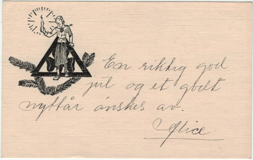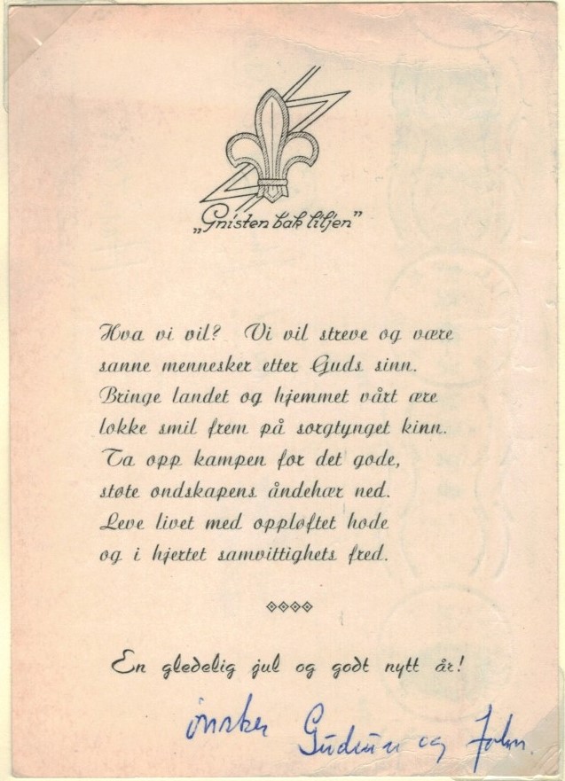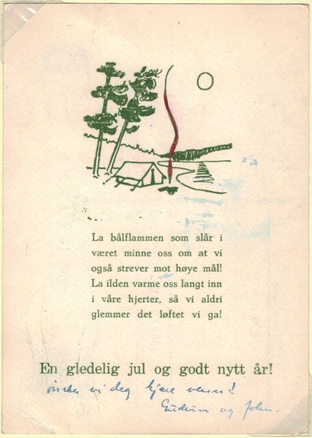 105. NSF julekort 1952. Påtrykk på helpostkort, antakelig laget av/for John Giæver. Tegningen er hentet fra Speideren nr. 4 1928. Tegnet av Thor Wiborg?