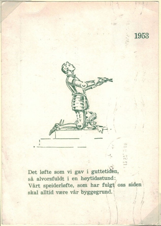 106. NSF julekort 1953. Påtrykk på helpostkort, antakelig laget av/for John Giæver. Tegningen er hentet fra Speideren nr. 5-6 1951. Tegnet av Thor Wiborg?