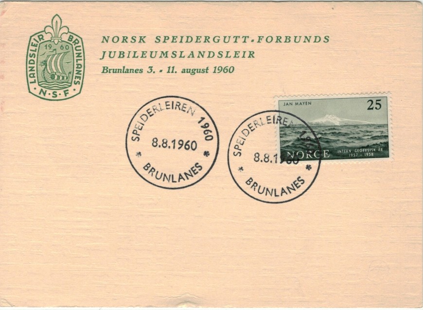 112. NSF 1960, forbundskontoret. Korrespondansekort (uten postkortbakside). Hvem har designet leirlogoen?