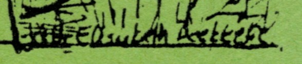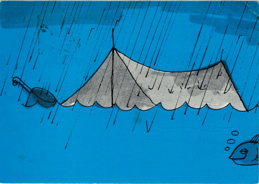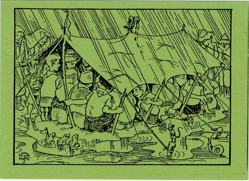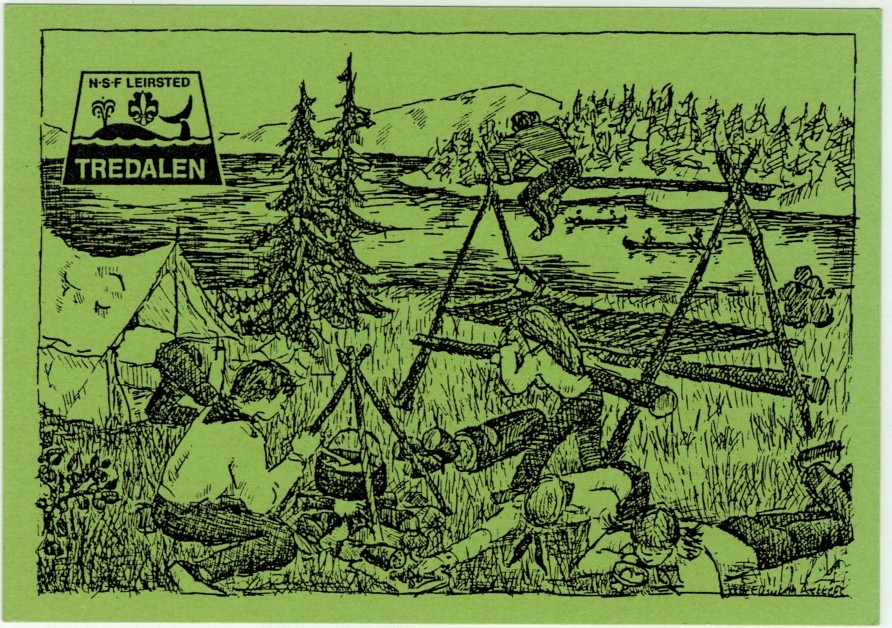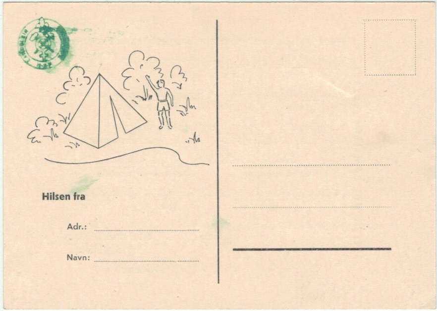 116. NSF. Strektegning på kort med grønt stempel fra landsleiren Røros 1972. Hvem er tegneren?
