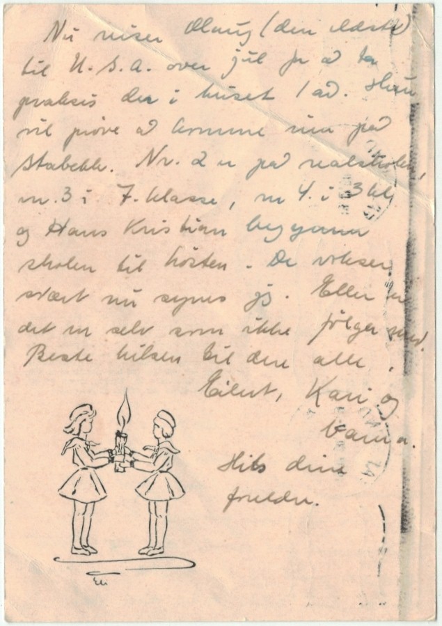 104. NSF julekort 1951. Påtrykk på helpostkort, antakelig laget av/for John Giæver. Tegnet av Thor Wiborg?