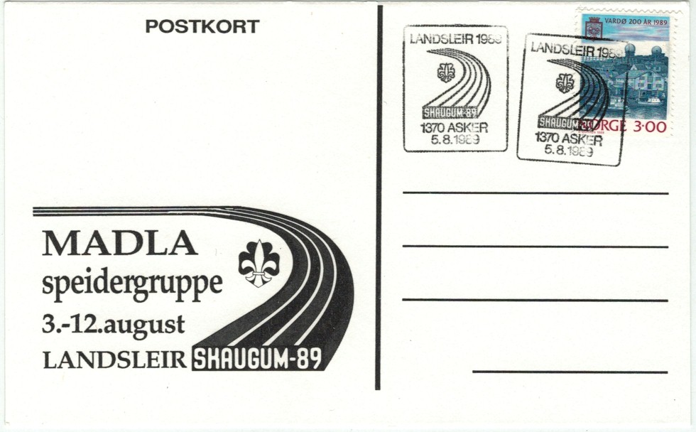 328. NSF 1989. Kortet er laget av/for Madla speidergruppe. Leirlogoen er lånt fra landsleiren/forbundskontoret, hvem har laget den?