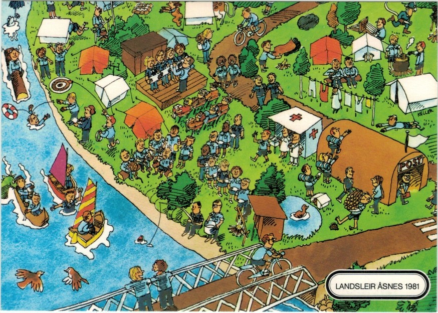 304. NSF 1983, lansdelsleiren i Nord-Norge. Initialer/signatur "KIKI" til venstre. Hvem er tegneren?