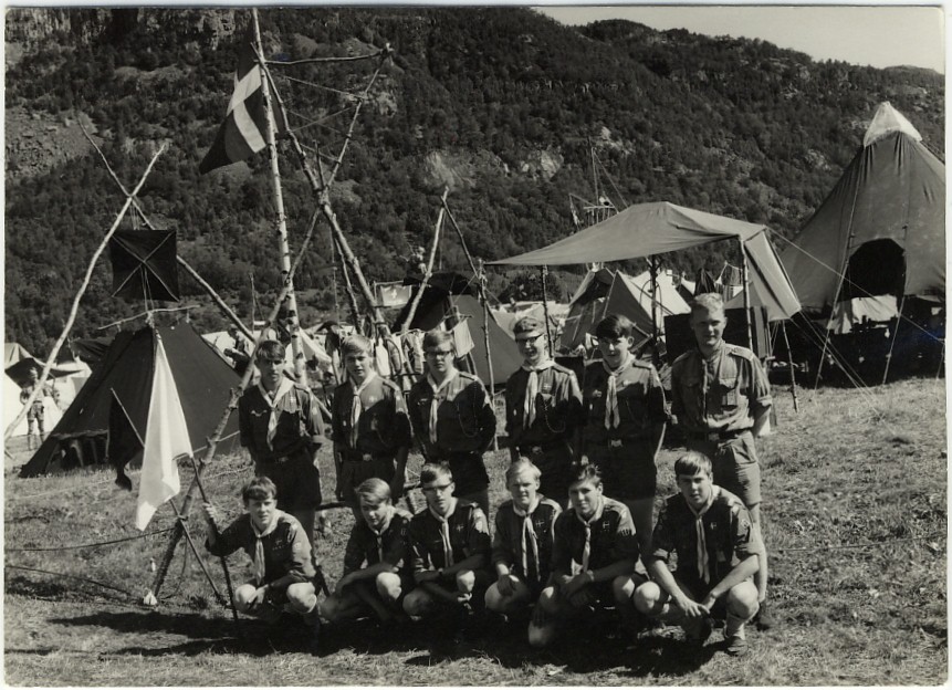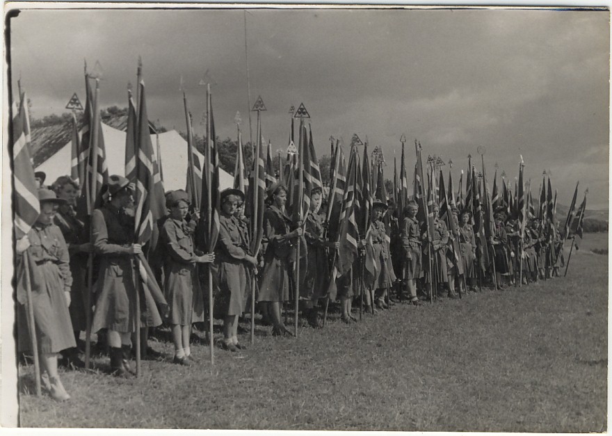 | 36. John Hansen opplyser at dette er danske FDF-ere (Frivilligt Drengeforbund) - ikke speidere. Det er et troppsbanner i bakgrunnen som viser en speiderlilje, så fotoet er nok tatt på en speiderleir - men ikke i Danmark! Er det en norsk leir? Se forstørrelse av troppsbanneret til høyre. |