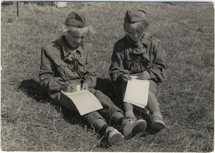 Kari kan skimtes til venstre ved bjørkestammen, i leirdrakt (utrolig upraktisk farge!) – hun er i dag kasserer i MS-gildet – og en av de andre lederne på kortet er også medlem av gildet i dag.