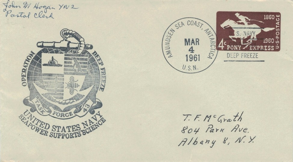 A "one-day post office" in the Amundsen Sea was established on March 4, 1961 on board the USS Glacier and USS Staten Island. Approximately 2500 covers were processed on both ships. Named for Norwegian polar explorer Roald Amundsen who led the first expedition to reach the South Pole in 1911. Operation Deepfreeze