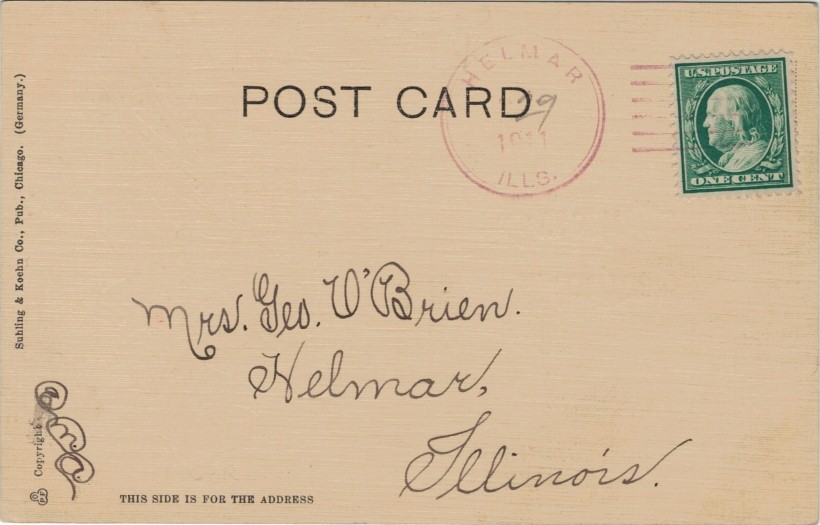 Helmar is a populated place in Kendall Co., Illinois. The village of Helmar was platted 1899. It was first called North Prairie, but due to duplicate name, a vote was taken, and it was decided to name the village Helmar, in honour of Hjalmar Anderson, a Norwegian immigrant. The Helmar, IL post office was established 1894 with Michael S. Fries and discontinued 1912, superseded by R.D. from Newark. Lister 2017 exhibition catalog, NFT 7/2017.