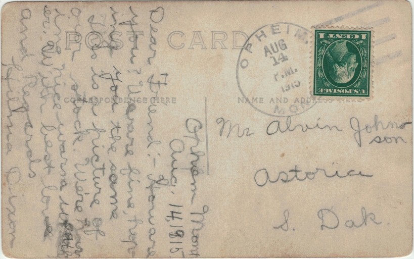 Opheim is a town in Valley Co., MT. It is named for Norwegian homesteaders Alfred and John Opheim, who began in 1910 with construction of the family’s sod house. The place grew during the homestead boom, and Opheim went from a single dwelling to a community that supported a bank, several mercantile stores, a bakery, a lumberyard, and a saloon. The Opheim, MT post office opened 1910 with John P. Opheim postmaster and it is still in operation. The population was 85 at the 2010 census. NFT 5/2017.