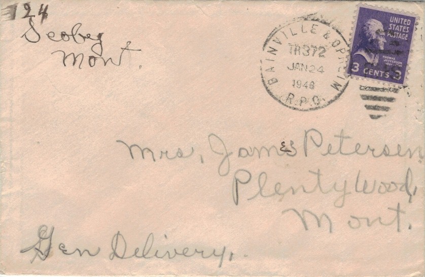 Railway post office for the 150 miles line between Bainville, MT and Opheim, MT (on the Williston, ND to Opheim, MT route). In operation 1933-1948. See Opheim, MT for the origin of the Opheim name. NFT 5/2017.