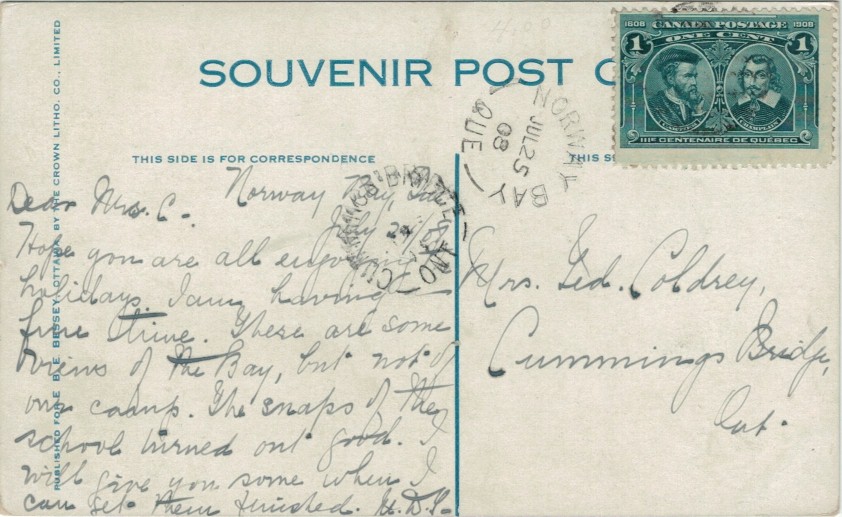 Norway Bay, post office in Pontiac, QE. Established 1902 with Reverend J.A. MacFarlane as postmaster. Obviously named for Norway, but the reason is not found. Summer post office for at least part of its operational life. Closed 1971.