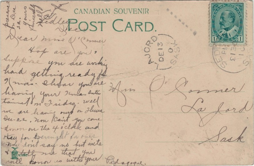 Leinan, post office in Rosetown – Biggar, SK. Established 1909 and named by and for postmaster Axel L. Leinan, (1877-1940), born in Trondheim, Norway. Closed (unknown year after 1952).