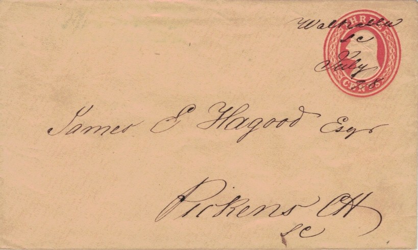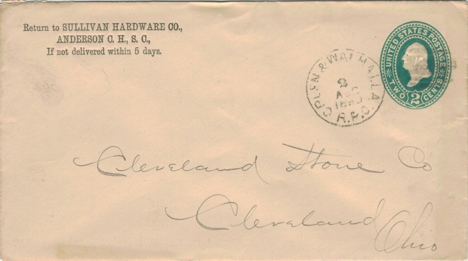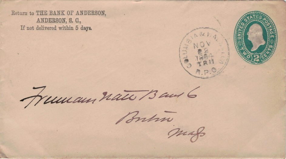 Greenville & Columbia Railway (Southern). Blue Ridge R.R. Carolina & Northwestern R.R. Route 337. Railway post office for the 50 miles line between Greenville, SC and Walhalla, SC, in operation 1887-1892; the postmark(s) may have been used longer. See Walhalla, SC for the origin of the Walhalla name.