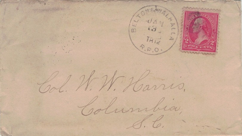 Greenville & Columbia Railway (Southern). Blue Ridge R.R. Carolina & Northwestern R.R. Belton to Anderson, Pendleton and Walhalla. Route 337. Railway post office for 46 miles the line between Belton, SC and Walhalla, SC. Belton & Walhalla Agent operated 1865-1882; a postmark was used at least until 1883. Belton & Walhalla R.P.O. operated 1886-1887 and Feb-Oct 1895; a postmark was used at least until 1904. See Walhalla, SC for the origin of the Walhalla name.