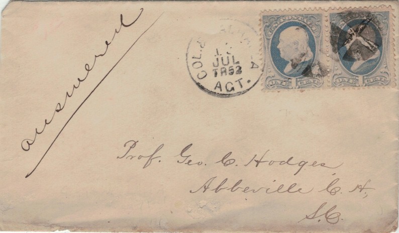 Greenville & Columbia Railway (Southern). Blue Ridge R.R. Carolina & Northwestern R.R. Columbia to Alston, Newberry, Greenwood, Belton and Greenville. Route 337. Railway post office for the 159 miles line between Columbia, SC and Walhalla, SC. Columbia & Walhalla Agent operated May-Aug 1882. Columbia & Walhalla R.P.O. operated 1882-1886 and 1892-1895. The postmarks may have been used longer. See Walhalla, SC for the origin of the Walhalla name.