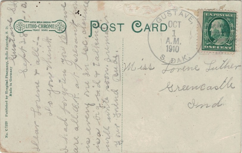 Gustave, farm post office established 1899 in Butte Co., SD, to Harding Co. 1908. The proposed p.o. name was Julia, but Gustave was selected, named for Gustave Sorenson, born in Norway 1873, son of Andrew Sorenson on whose farm the post office was established, with Ancher N. Sorenson postmaster. Discontinued 1954 with mail to Camp Crook.