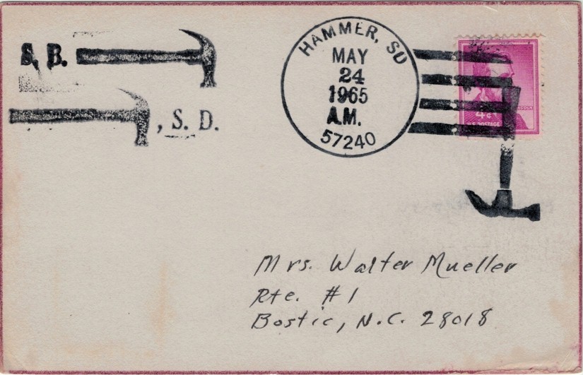 Hammer is a community in Roberts Co., SD. It was named after the Norwegian immigrants Gunder and Iver Hammer, the original owners of the town site. The Hammer, SD post office was established 1915 with Alexander O. Johnsen as postmaster. A fancy cancel with the shape of a hammer is often applied to mail from Hammer, SD. The post office closed 1973 with mail to New Effington. The population was 76 in 2010.