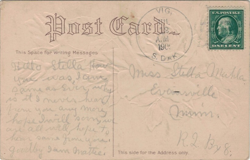 Vig, post office in Norway Twp., Roberts Co., SD. Named for Peder Gunval Vig (born 1838, Vik, Skudenes, Norway). Established 1902 with Alfred W Thompson as postmaster. Discontinued 1914 with mail to Veblen.