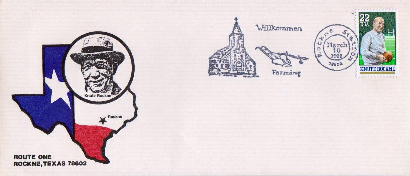 Rockne Station, a one-day post office in Bastrop Co., TX, in operation on 10 March 1988. Commemorating Knute Rockne, a Norwegian-American football player and coach at the University of Notre Dame, IN. Dag Henriksbø writes about Rockne Station, TX.