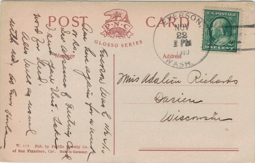 Vinland Wharf & Holly, WA, steamboat on Hood Canal, on the 25 miles line between Vinland Wharf and Holly, Kitsap Co., WA. Operated by Hansen Trans. Co. 1918-1924. Hood Canal is a fjord and not a canal in the sense of being a man-made waterway. The Holly and Vinland Wharf, WA R.P.O. was redesignated the Vinland Wharf and Holly, WA R.P.O. in 1922. See Vinland, WA for the origin of the Vinland name.