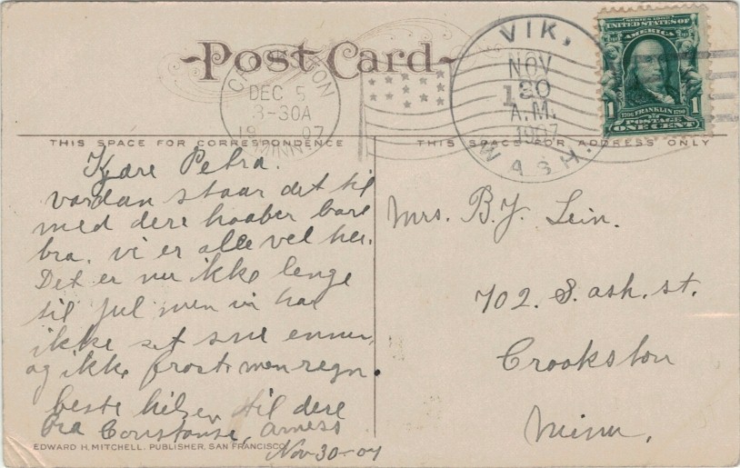 Vik, a small community in Wahkiakum Co., WA. It was named for Vik in Helgeland, Norway. The post office was established 1906 with Carrie (Karen) Bjorge as postmaster, the wife of Ole Adolf Waldemar Bjørge Rønning, originally from Ølsås, Vik in Helgeland. The post office closed 1909.