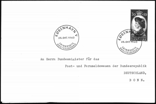 Purchased on Ebay in 2002, this Girl Guide item was hitherto unknown to me. It is a presentation folder for the Denmark Girl Guide stamp, issued October 25, 1960. The presentation folder was mailed from the Danish postal authorities to their colleagues in West Germany on the First day of Issue, informing about the new stamp. The presentation folder has on front a printed text in Danish, which gives information about the new stamp. Inside (page 2) of the folder is blank. Inside (page 3) contains a black print of the stamp in enlarged format, affixed to the folder. The reverse (page 4) is the address side with stamp and first day cancel. Please inform the author should you have further information on this presentation folder. |