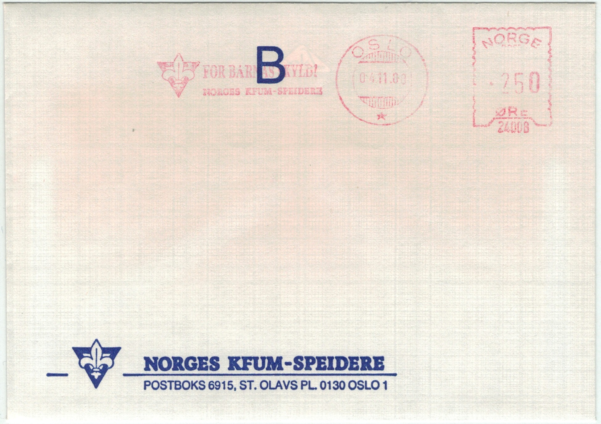 | N-X-OSL-026 | 1989 | 24008 | KFUM | For barnas skyld! Norges KFUM-Speidere | |