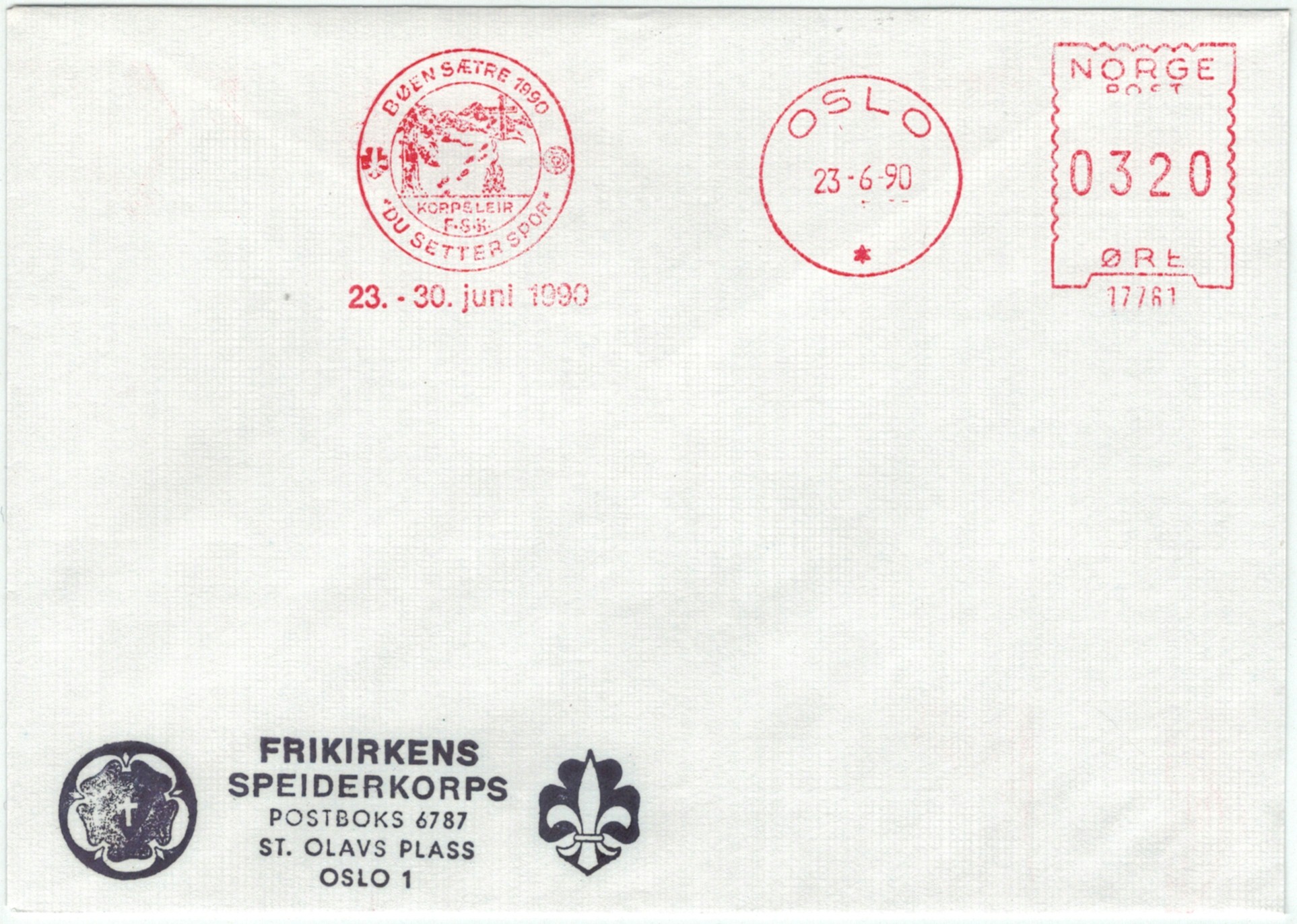 | N-X-OSL-027 | 1990 | 17761 | FS | Korpsleir Bøen Sætre 1990. "Du setter spor" | |