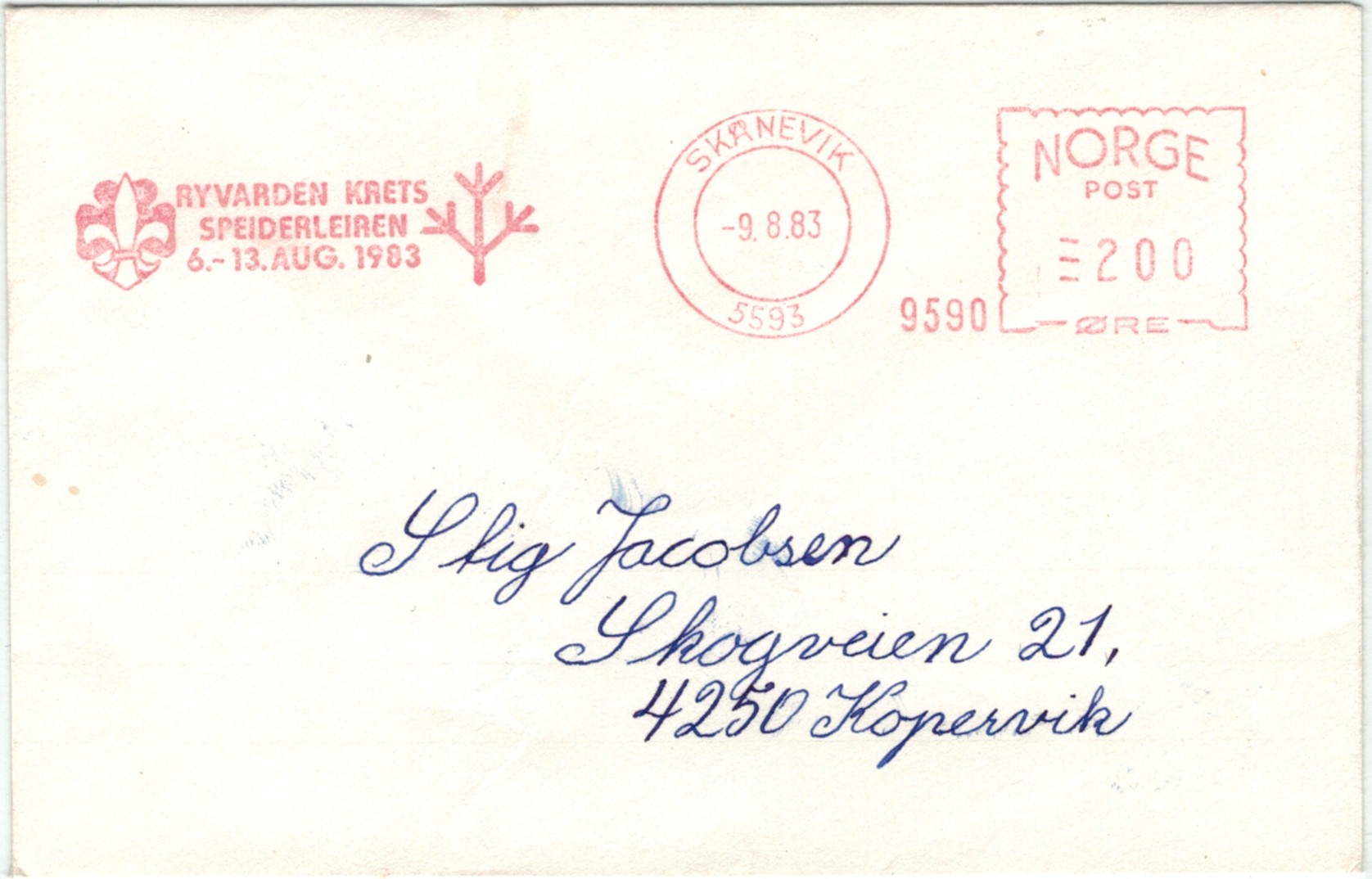 | N-X-SKA-001 | 1983 | 9590 | NSF | Ryvarden Krets, speiderleiren 6.-13. aug. 1983 | |