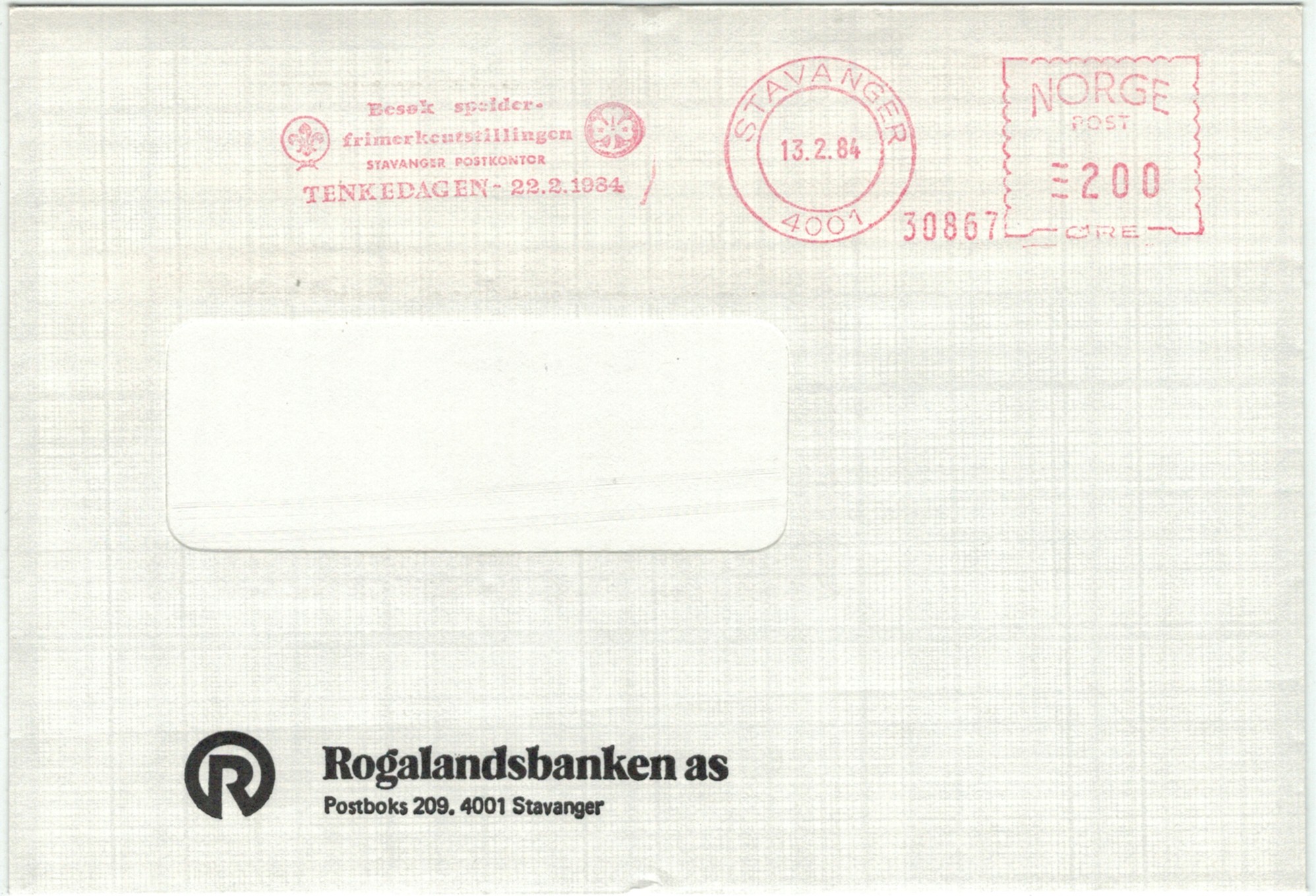 | N-X-STA-001 | 1984 | 30867 | - | Besøk speiderfrimerkeutstillingen Stavanger Postkontor Tenkedagen 22.2.1984 | |