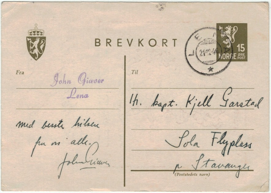 | N-G-000-1947 | Postal card | 1947 | Issued privately by John Giæver? Additional private printing on official postal card. | Christmas and New Year greeting. | |