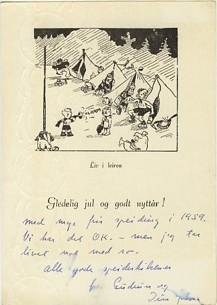 | N-G-000-1959 | Postal card | 1959 | Issued privately by John Giæver? New! Additional private printing on official postal card. | Christmas and New Year greeting. | |