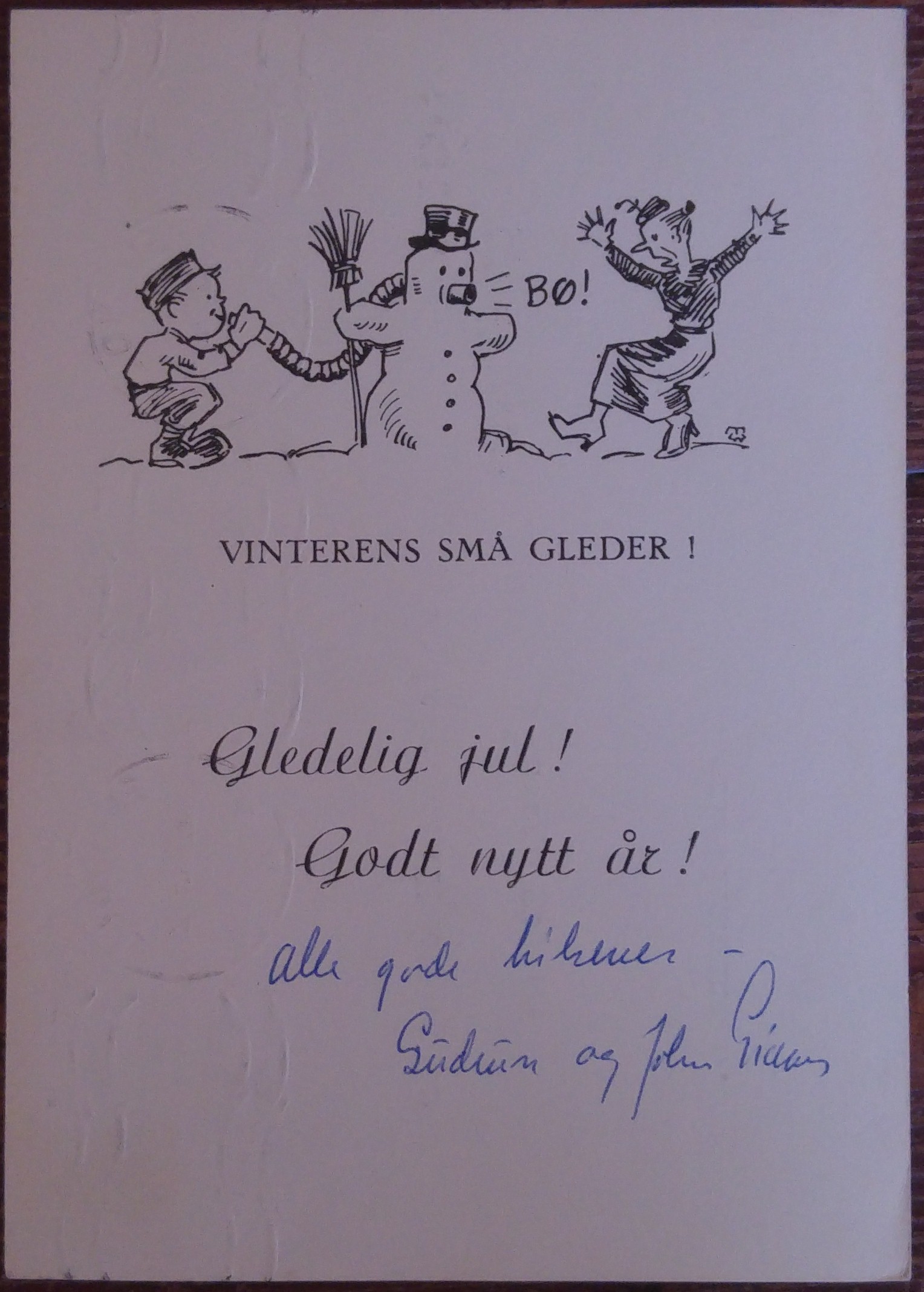 | N-G-000-1955 | Postal card | 1955 | Issued privately by John Giæver? Additional private printing on official postal card. | Christmas and New Year greeting. | |
