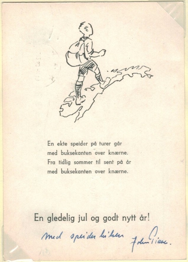 105. NSF julekort 1952. Påtrykk på helpostkort, antakelig laget av/for John Giæver. Tegningen er hentet fra Speideren nr. 4 1928. Tegnet av Thor Wiborg?