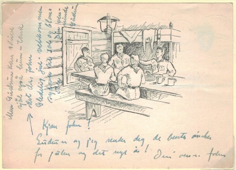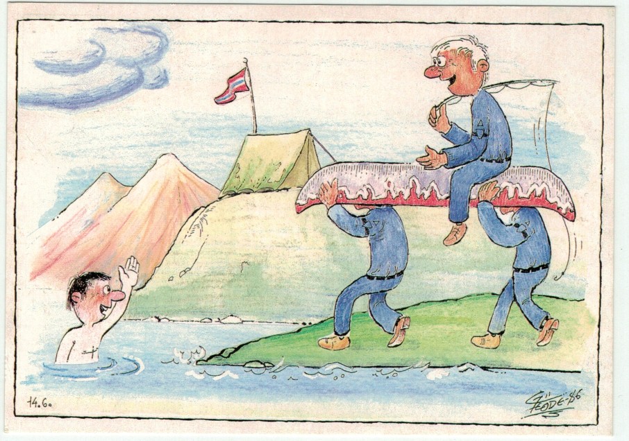 313. NSF, leirstedet Hammeren, ca. 1990? Stort dobbeltkort med blank bakside. Hvem er tegneren?