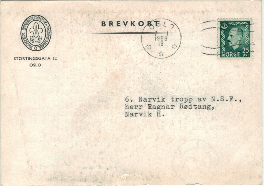 111. NSF 1958, forbundskontoret. Hvem har tegnet / designet logoen til NSF? Beltespenne med oval logo ble rettsbeskyttet i 1926 (Speideren 1927 nr 2).