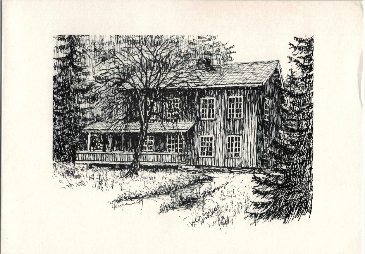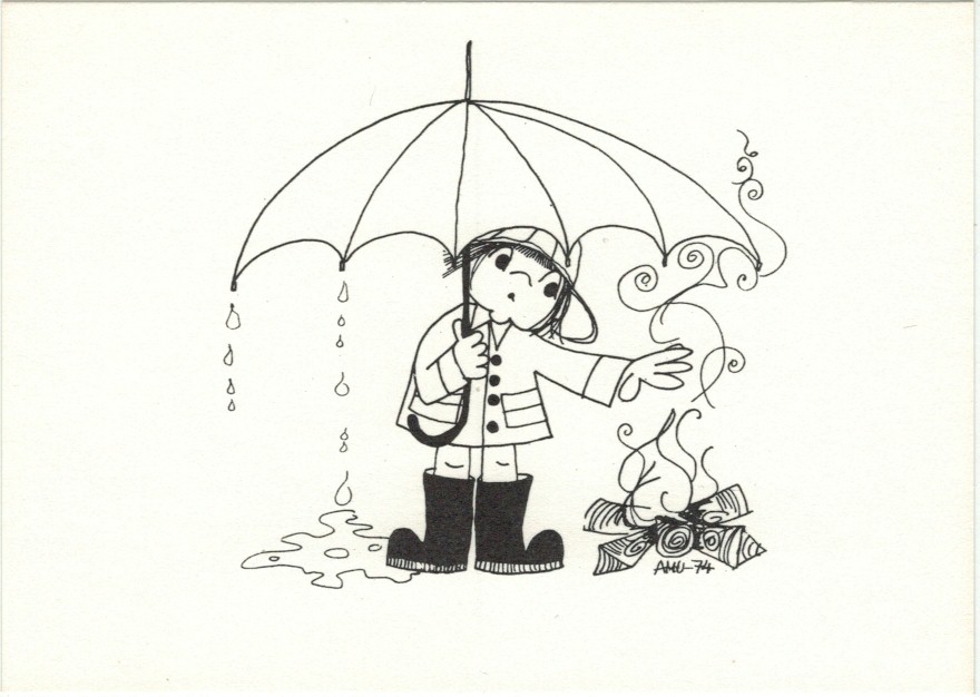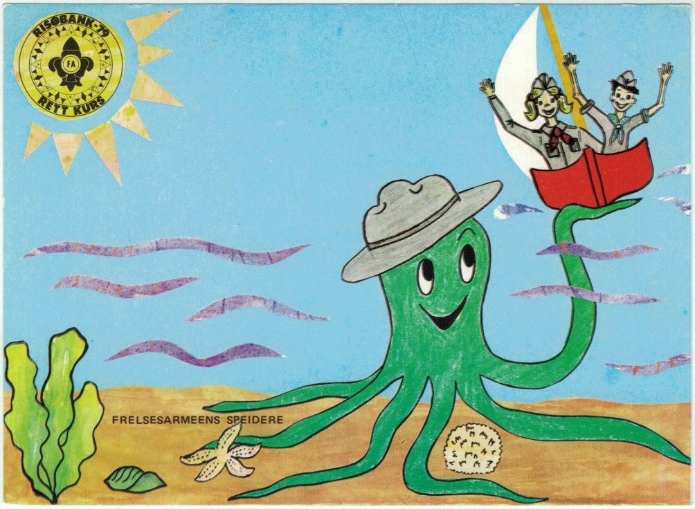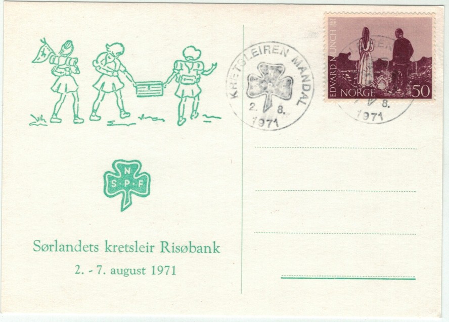 116. NSF. Strektegning på kort med grønt stempel fra landsleiren Røros 1972. Hvem er tegneren?