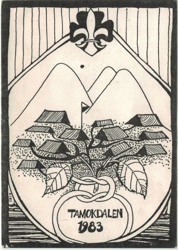 304. NSF 1983, lansdelsleiren i Nord-Norge. Initialer/signatur "KIKI" til venstre. Hvem er tegneren?