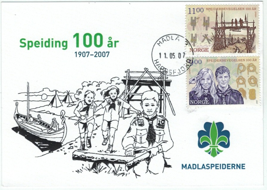 329. NSF 2007. Kortet er laget av Ivar Anton Nøttestad for Madlaspeiderne. Strektegningen er fra et ark med speiderklipp(?), hvem har laget den?