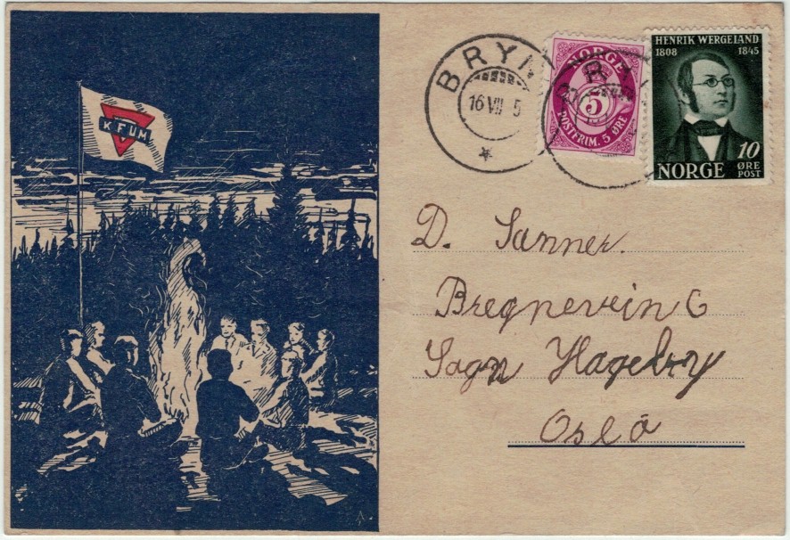 401. KFUM juli 1945 (før Norges KFUM-Speidere ble stiftet). Hvem er kunstneren? Datert Braut og stemplet Bryne, hva slags arrangement kan det ha vært?