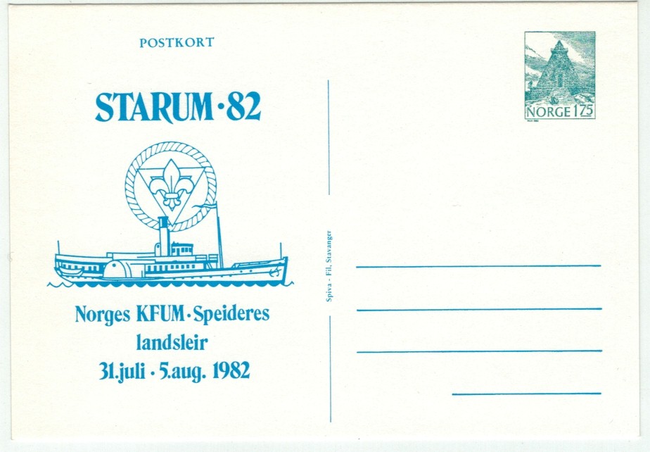 407. KFUM 1982. Kortet er laget av Steinar Halvorsen for Spiva-Fil (Norsk Speiderfilatelistisk Gruppe). Hvem har tegnet logoen (Skibladner)?