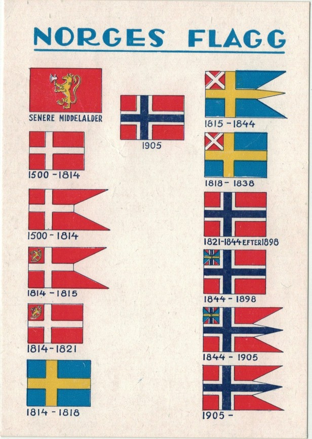 55. Ubrukt kort, ser tre norske flagg. Kirketårn i bakgrunnen, hvor og når kan dette være? (Klikk for større bilde)