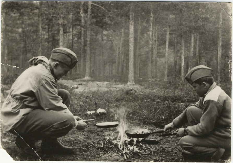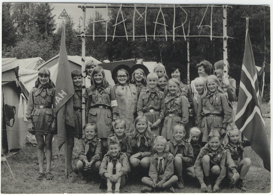 Kari kan skimtes til venstre ved bjørkestammen, i leirdrakt (utrolig upraktisk farge!) – hun er i dag kasserer i MS-gildet – og en av de andre lederne på kortet er også medlem av gildet i dag.