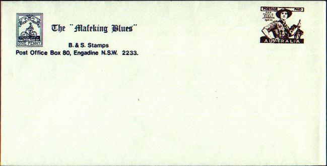 ![]() ![]() ![]() Unknown year, 1980's?, Postage Paid imprint on envelopes (various paper colour). B.&S. Stamps, Engadine N.S.W. ![]() Unknown year, 1980's?, Postage Paid imprint on two postcards; depicting the Mafeking Warner Goodyear stamp and the Baden-Powell stamp. B.&S. Stamps, Engadine N.S.W.