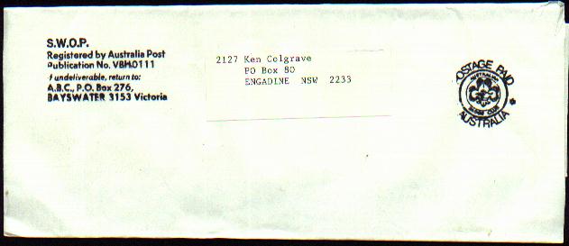 |  Unknown year, 1980's?, Postage Paid imprint on wrapper. Australia Badge Club, Bayswater, Victoria.  Unknown year, 1980's?, Postage Paid imprint on cover. Australia Badge Club (Bayswater, Victoria). |