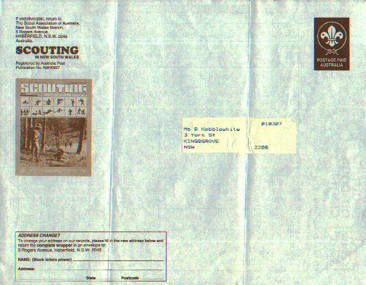 |  1990's?, Postage Paid imprint on computer generated printout, used as wrapper for Scout magazine. The Scout Association of Australia, Toowong, Queensland. |
