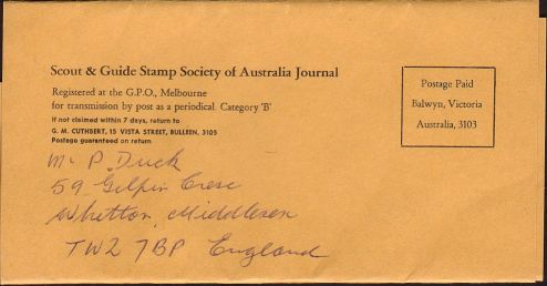 |   Unknown year, 1970's?, Postage Paid imprint on wrapper. Scout & Guide Stamp Society of Australia, Balwyn, Victoria. |