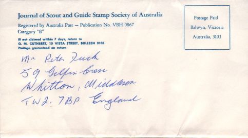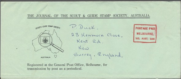 ![]() ![]() Unknown year, 1970's?, Postage Paid imprint on wrapper. Scout & Guide Stamp Society of Australia, Balwyn, Victoria. |
