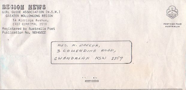![]() Unknown year, 1970's?, Postage Paid imprint on bulletin "Region News". Girl Guide Association, East Corrimal, N.S.W. |
