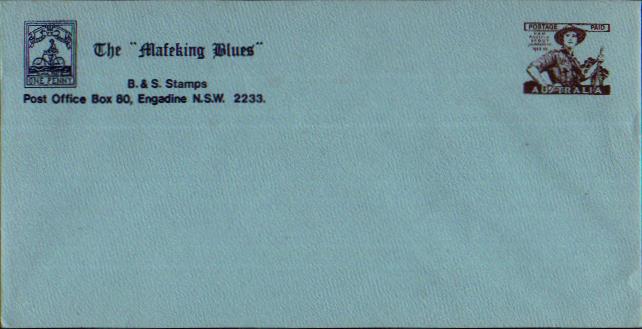 |    Unknown year, 1980's?, Postage Paid imprint on envelopes (various paper colour). B.&S. Stamps, Engadine N.S.W.  Unknown year, 1980's?, Postage Paid imprint on two postcards; depicting the Mafeking Warner Goodyear stamp and the Baden-Powell stamp. B.&S. Stamps, Engadine N.S.W.     |